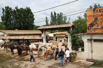 In Portiragnes Plage gibt es zwei Reitställe, die Ausritte in Gruppen anbieten ( 1-stündig 14 €, 2-stündig 25 € - alte Preise - 2023 ?). Selbst Unerfahrene können sich hier einmal auf einen Pferderücken begeben - sie werden auf einen gutmütigen "Touristengaul" gesetzt (so erging es mir jedenfalls) , der willig in der Gruppe mittrottet. Für Kleinkinder bietet der Stall an der Kanalbrücke auch einzeln geführtes Ponyreiten an. |